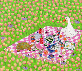 Amanda creates worlds and scenes full of animals, snacks, drinks, sweets, games, decor, and more with colored pencils. Known for her tablescapes and fun use of color and pattern, she makes her imagination come alive on paper- loveable animals at the forefront. Her work can be described as detailed, bright, happy, and FUN!